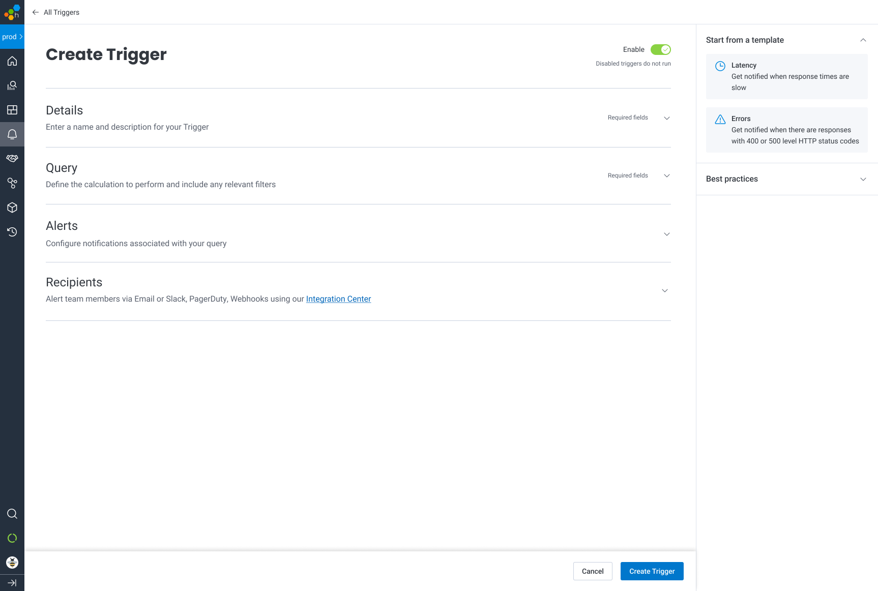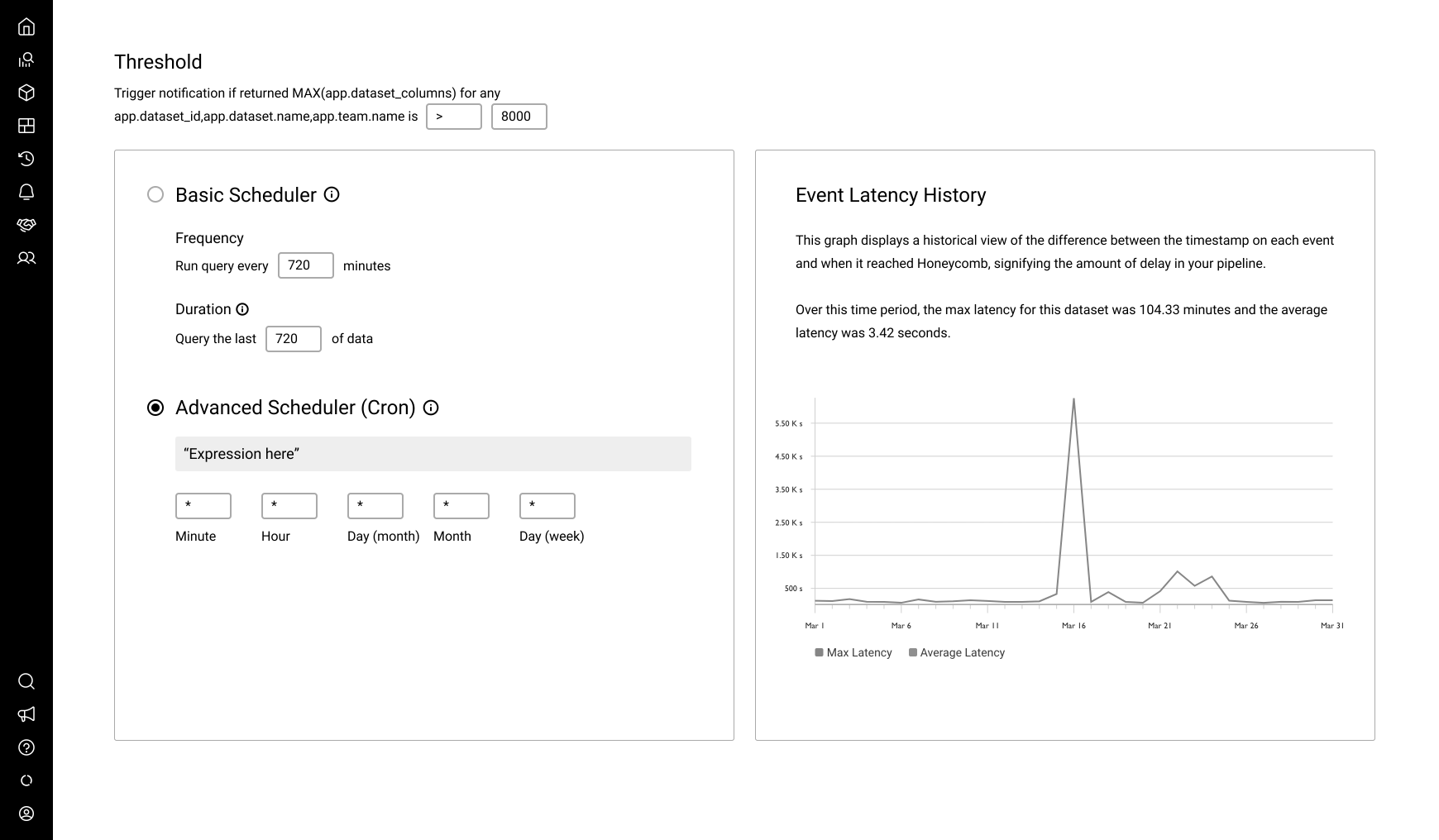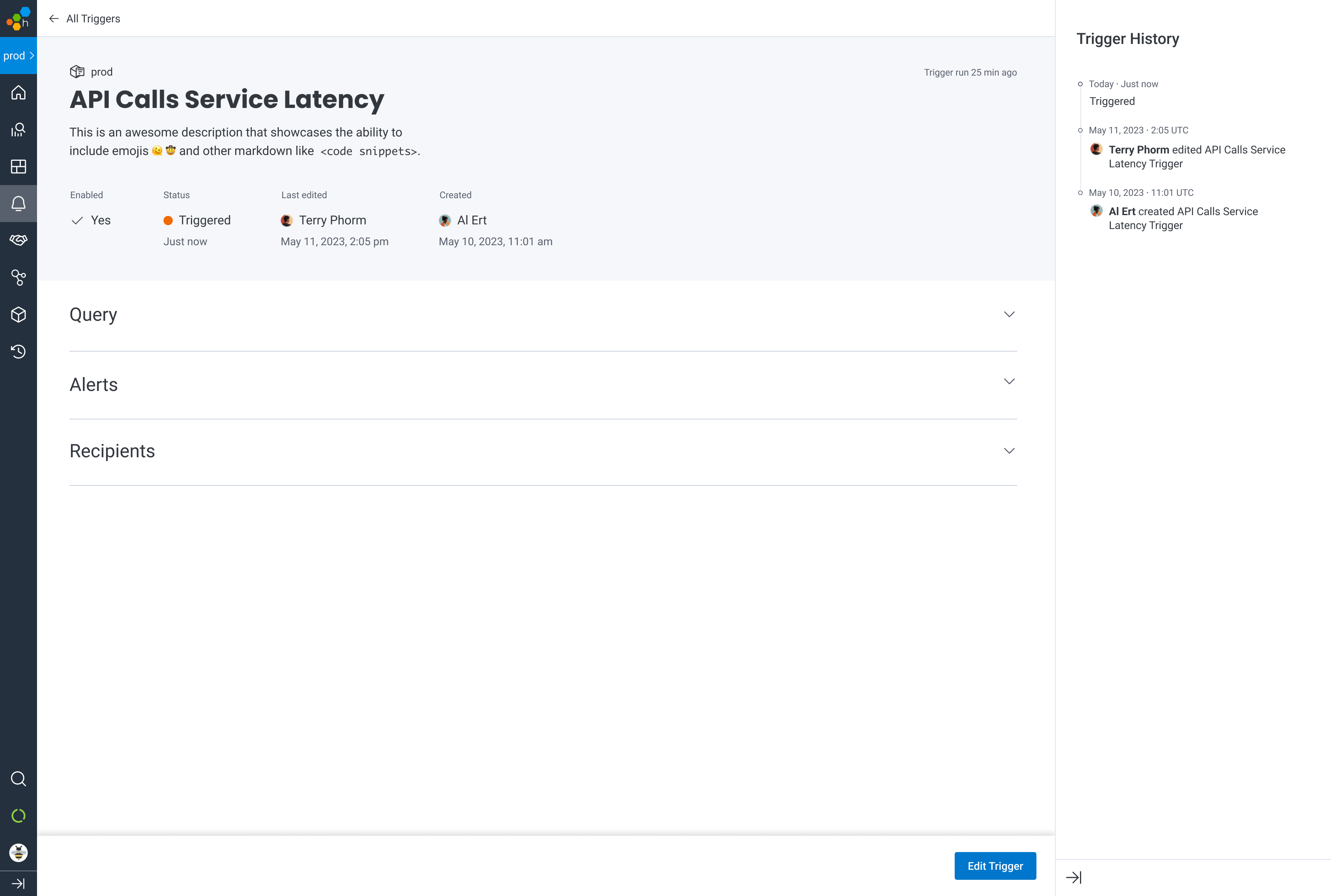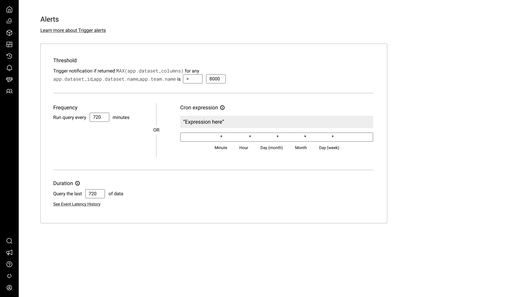 SREs configure their alerts using the Triggers feature. When crafting a new Trigger, the user writes a query to be run and evaluated at a desired frequency. If the query result passes the threshold the user defines, recipients are notified via any combination of: Email, Slack, PagerDuty, or Webhooks.