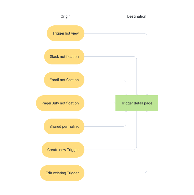 Various entry points for the Trigger detail page, where alerts are created or edited