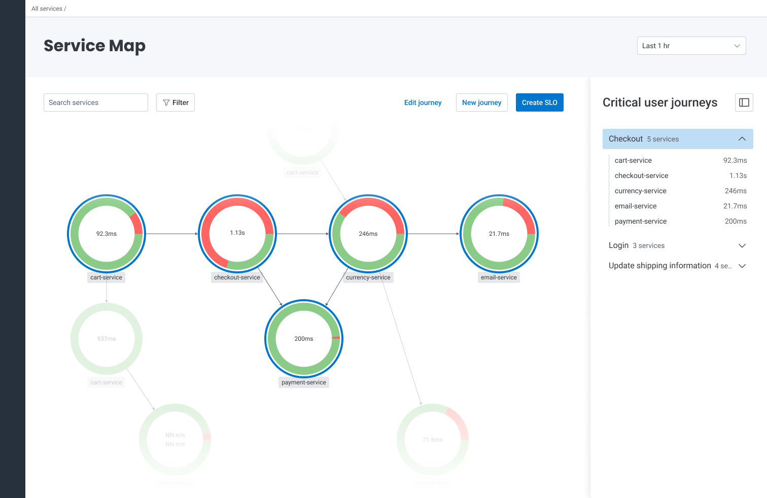 Critical User Journey and SLO creation from the Service Map, where users gather context about service health and interdependencies.