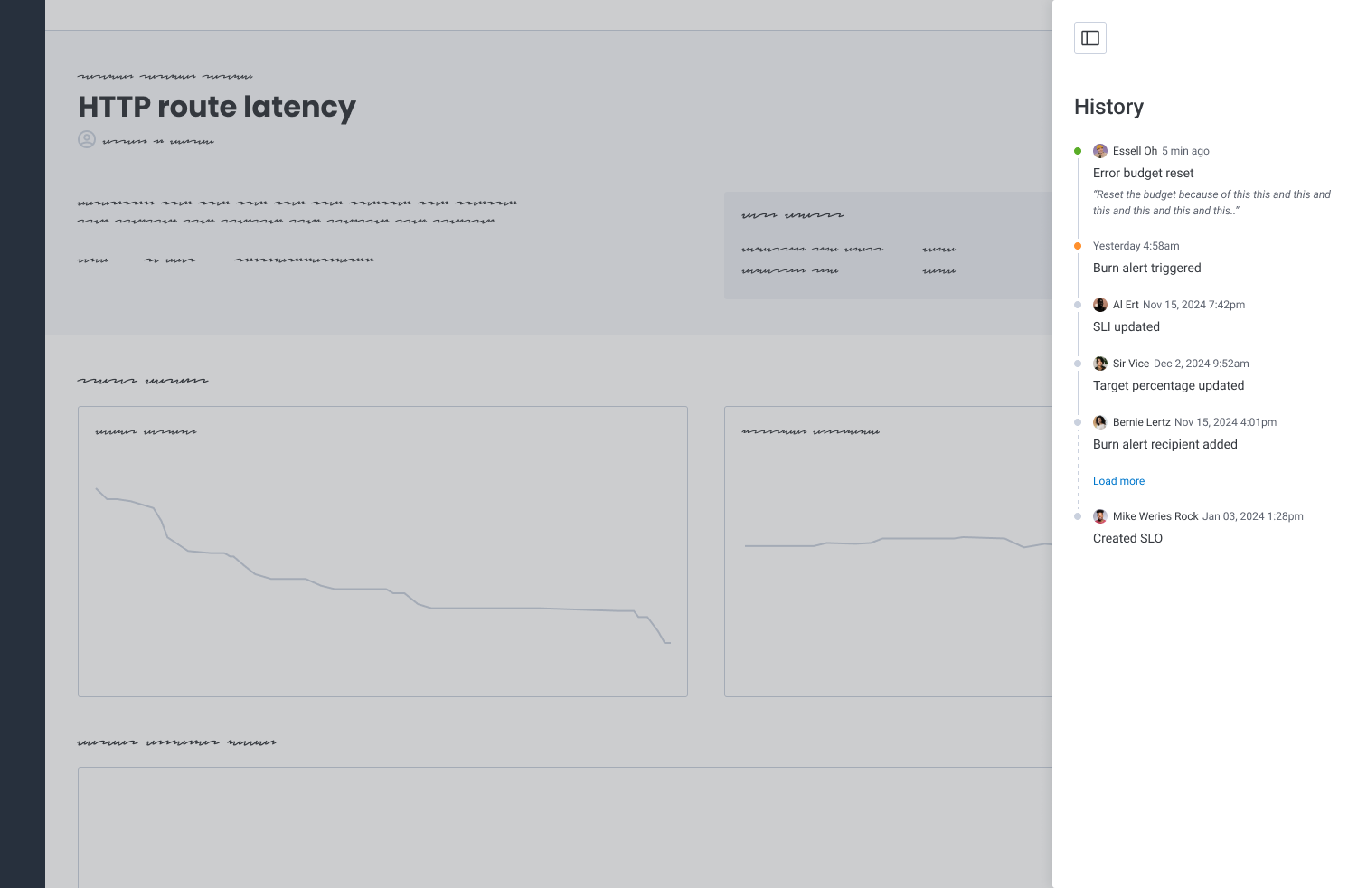SLO history to gather context about error budget resets, SLI updates, and target tweaks.