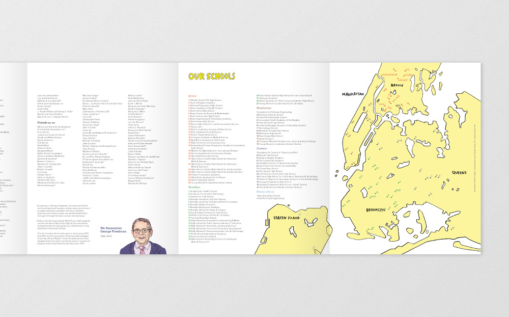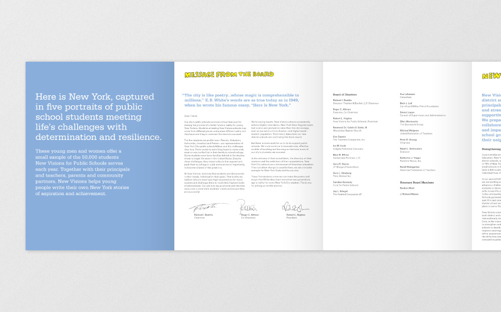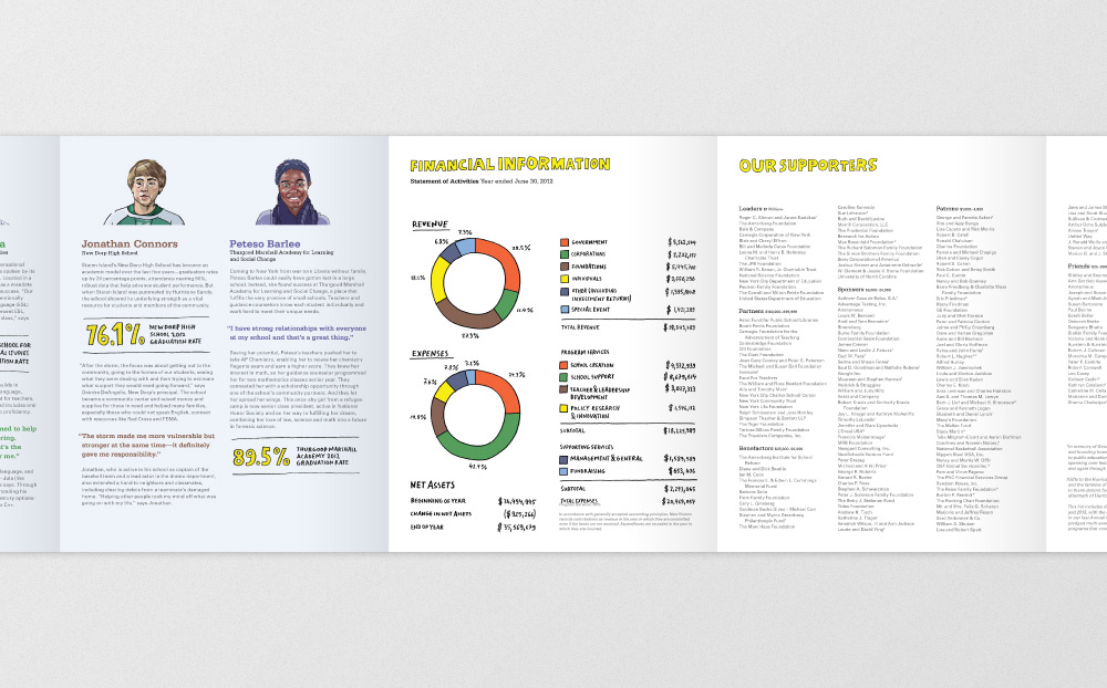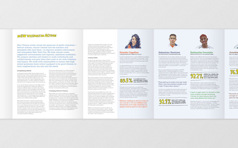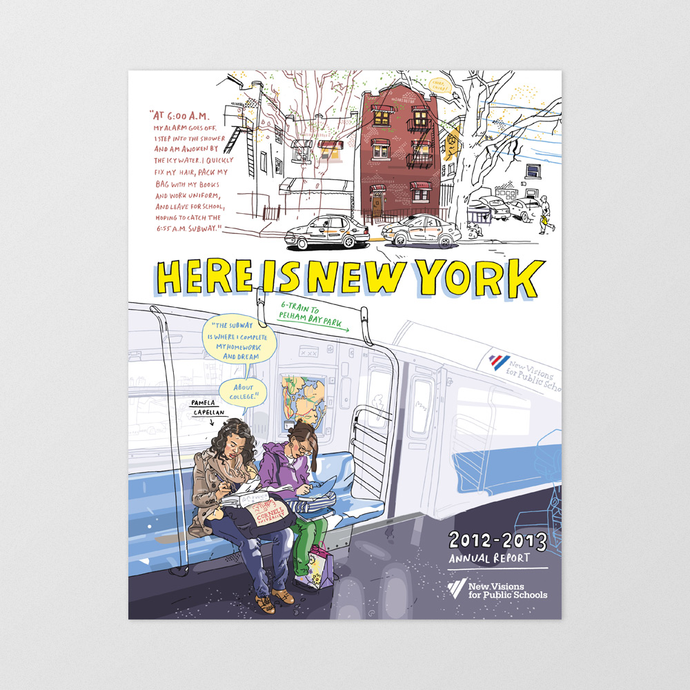 In collaboration with London reportage illustrator Olivier Kugler, I designed New Vision's annual report; a double-sided, twelve-panel accordion-fold book that follows the lives of five inspiring New York City students.