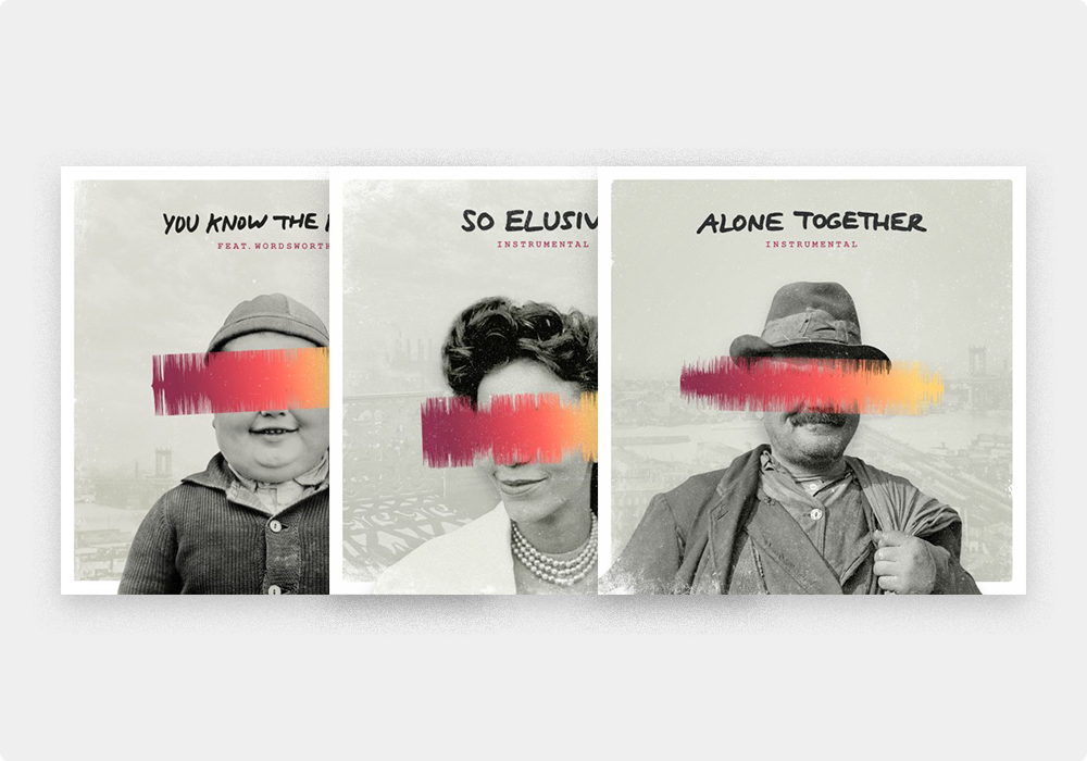 Leading up to the final release date, I decided to publish three of the album's tracks as singles to drum up awareness. I sent several of my favorite songs to a group of trusted friends (with varied musical tastes) and asked which ones they liked best. The patterns in their responses were immediately clear, which helped inform my decisions. In a way, crowdsourcing guaranteed more success for the singles because the end consumers were choosing what they wanted to hear, eliminating any guesswork or assumptions. After designing the first single's artwork, I used it as a template to keep the artwork consistent across all three. The template consisted of a vintage New York cityscape, a vintage portrait, a sonic waveform obscuring the subject's identity, and a handwritten song title at the top.
