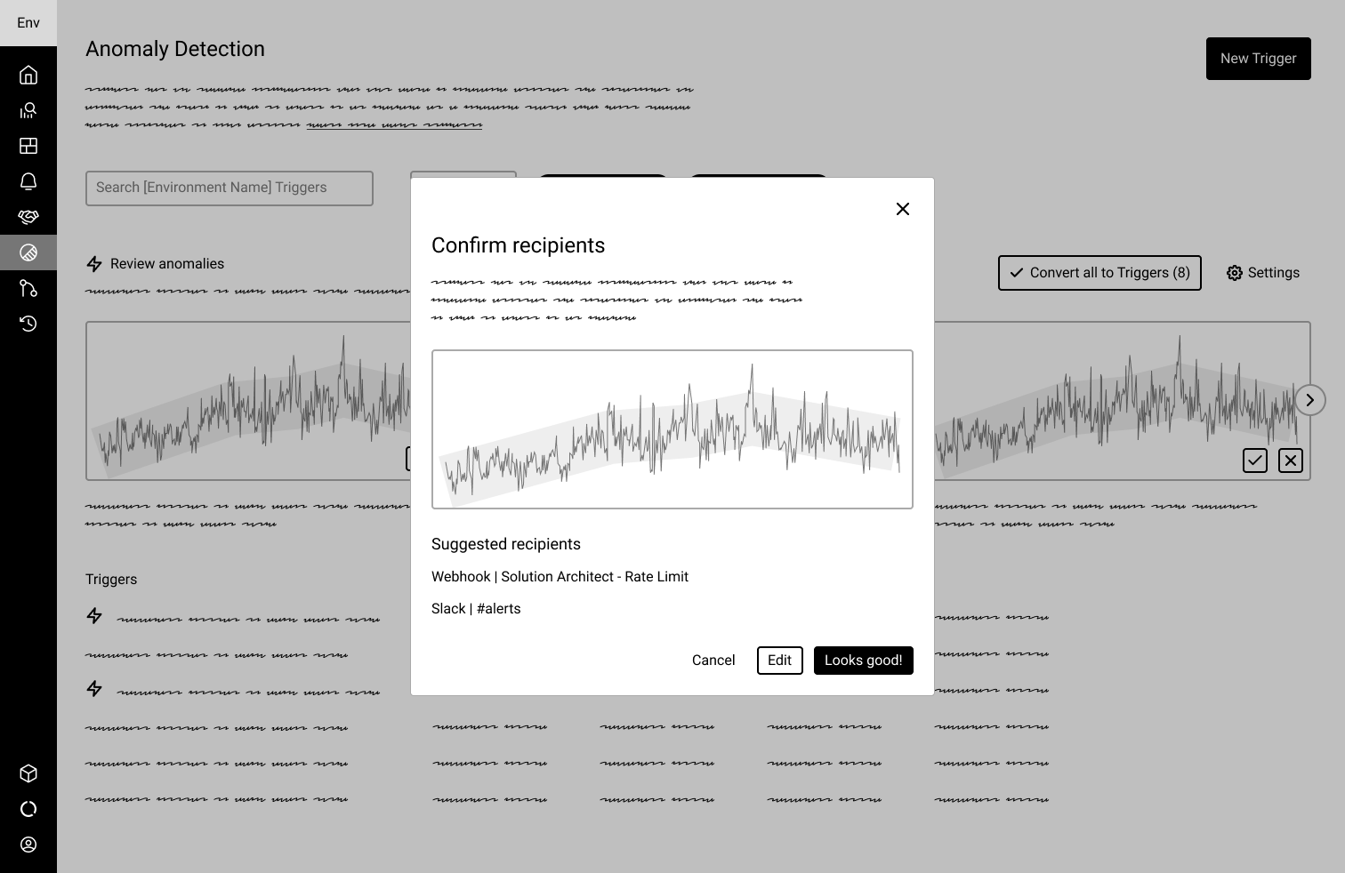 An early vision for a new screen where users could review detected anomalies and quickly configure alerts for them in bulk.