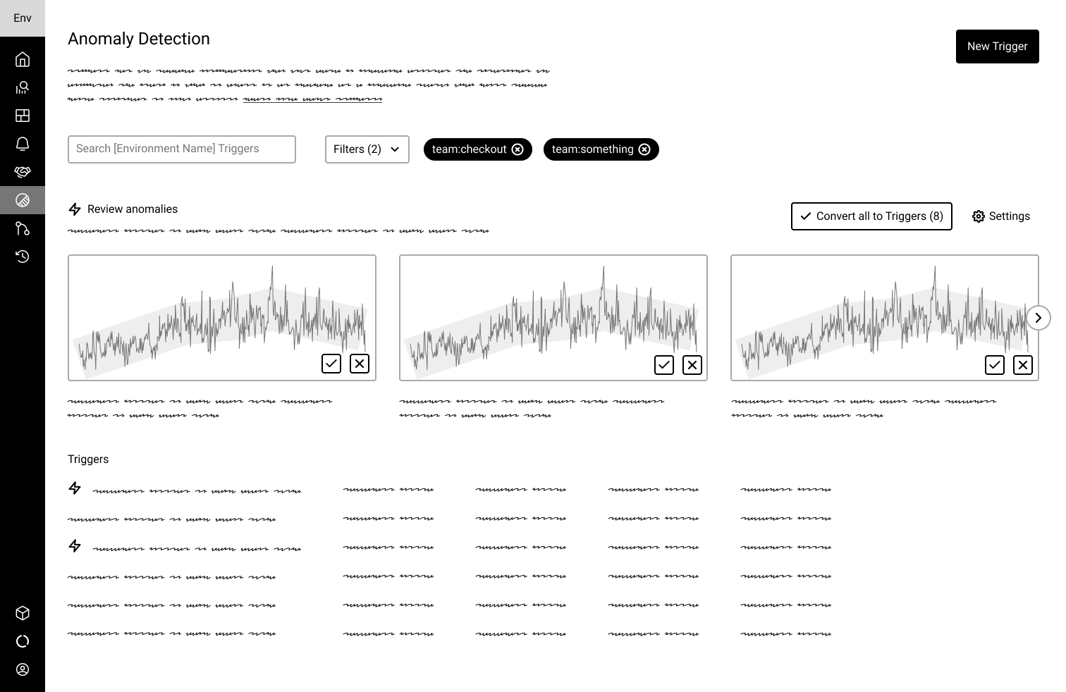 To reduce engineering effort and still provide a delightful experience, I proposed making use of our existing components and patterns wherever possible. This meant upcycling our list view, which was already being used for Triggers and SLOs. The previous quarter, another Product Designer contributed a drawer component to our design library, a panel that would slide over the top of a page from the right side of the browser. This panel would be a perfect home for our anomaly detail content. During development, engineering ran into an issue where tool tips within the drawer didn't display. I worked with the App Enablement Team, who maintains our design library, to address this at the component level. This small investment allowed tool tips to be used in any future implementations of the drawer component, for all product teams.