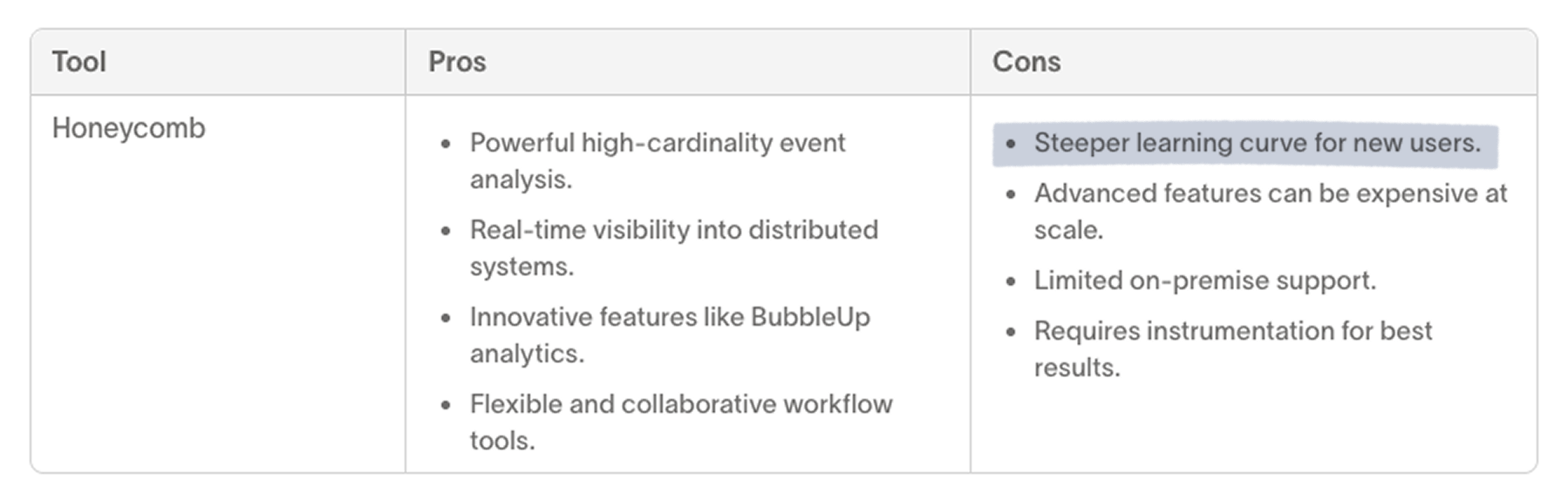 As evidenced by Ramp.com's vendor assessment, Honeycomb's set up contributed towards its reputation as a tool best suited for advanced teams.