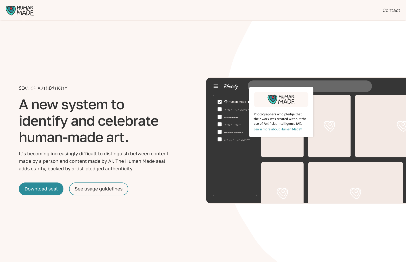 Human Made is a visual seal system that helps internet users understand if the image, video, site, or other visual artifact has been created by a person or AI. Creators can use a micosite to read usage guidelines and download assets like PNGs and SVGs, which they can apply to their work.