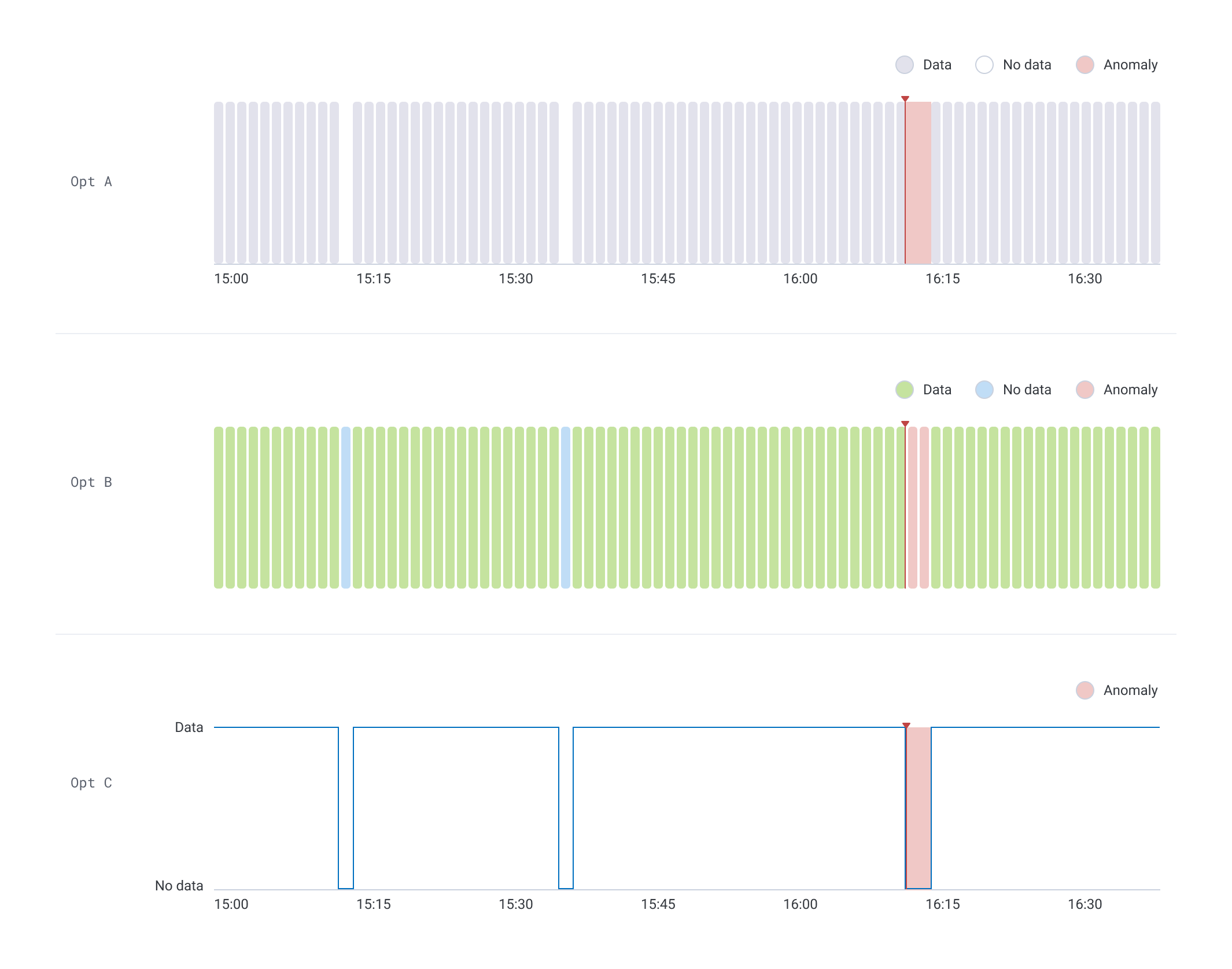 An important nuance of data presence is that you can have a lack of data that isn't sustained long enough to be an anomaly. The UX challenge: How do you visually distinguish between an interruption in data that's anomalous and one that isn't? Despite having many data visualizations types across the platform, Honeycomb had never needed to graph binary data. As such, it was crucial to represent data presence in an intuitive way, since our explorations would likely become the standard for graphing binary data elsewhere in Honeycomb. To derisk, I worked with our tech lead to understand what data visualizations were supported by our charting library. With this constraint in mind, I mocked a fictitious scenario using three graph styles and posted them in a survey to our customer Slack space. We acknowledged a certain amount of bias from this channel, given many of the responses come from a group of Honeycomb champions, but we felt some signal would increase our confidence. The feedback indicated that a categorical bar chart, where a lack of data was represented by a gap, was most intuitive (Opt A).