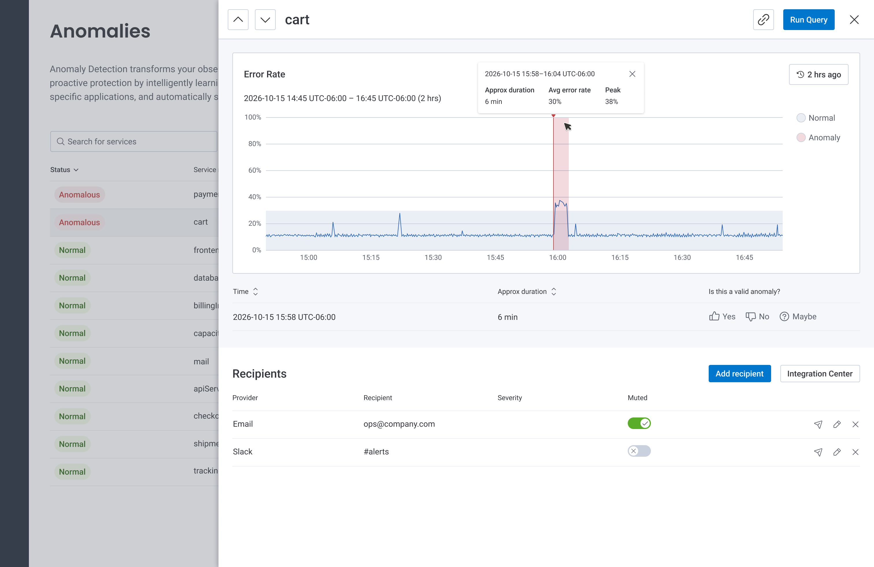 We envisioned a world where Anomaly Detection eliminated long-standing friction for alert creation. By learning normal service behavior and improving over time, the algorithm would automatically detect true irregularities in signals like error rate and latency, before they impact our customers' customers. The value proposition: reduce false positives and alert fatigue for software developers.
